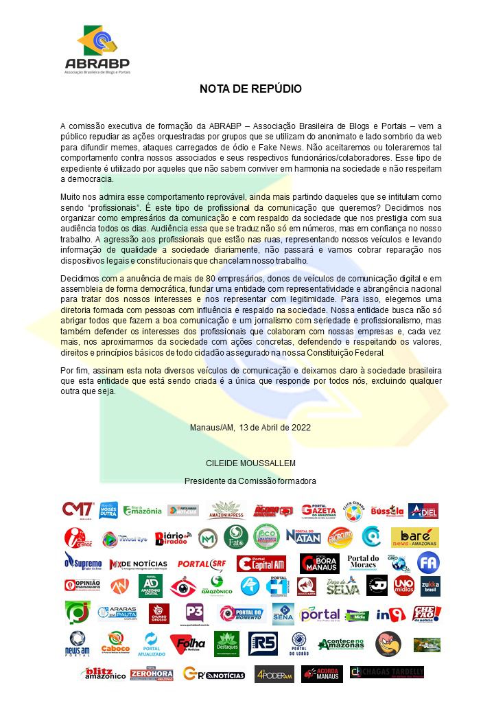 A Associação Brasileira de Blogs e Portais (ABRABP), que representa mais de 80 sites de notícias, divulgou uma nota, na tarde desta quarta-feira (13), de repúdio aos atos de agressão e desrespeito contra os profissionais da comunicação. A nota combate, também, ataques de pessoas que se denominam “profissionais”, mas que difundem Fake News contra jornalistas.