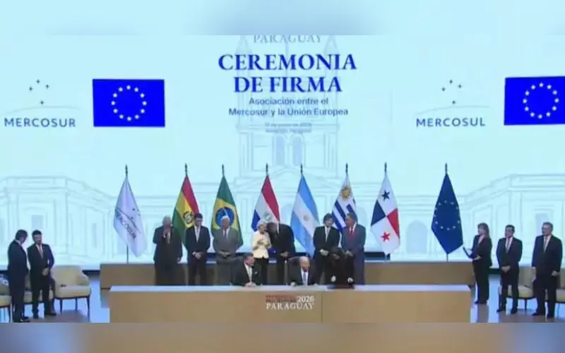 O acordo comercial entre o Mercosul e a União Europeia foi assinado neste sábado (17), em Assunção, no Paraguai, encerrando mais de 25 anos de negociações. A cerimônia contou com a presença de líderes sul-americanos e europeus, incluindo a presidente da Comissão Europeia, Ursula von der Leyen, e os presidentes de Paraguai, Argentina, Uruguai e Bolívia. O chanceler Mauro Vieira representou o Brasil.