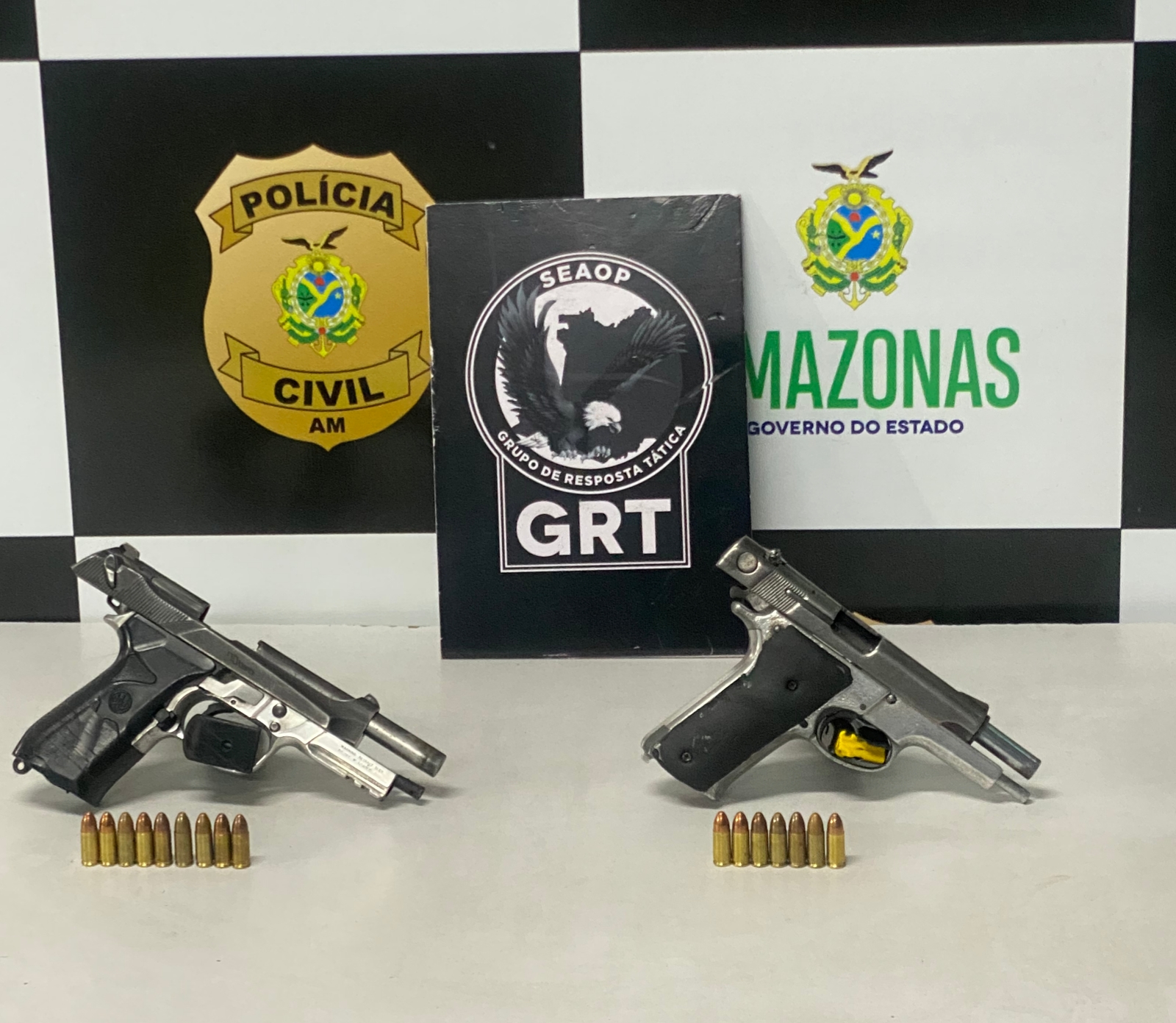 Com eles, os policiais apreenderam duas armas de fogo calibre 9 milímetros, que foram levadas ao 1º Distrito Integrado de Polícia (DIP).