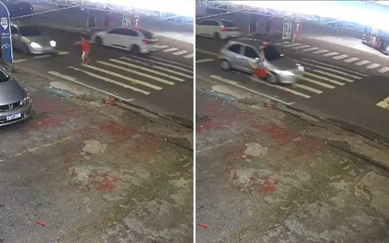 A idosa atravessava a via pela faixa de pedestres quando um carro modelo Celta, de cor prata, lhe atingiu e a arremessou sobre o capô do veículo.