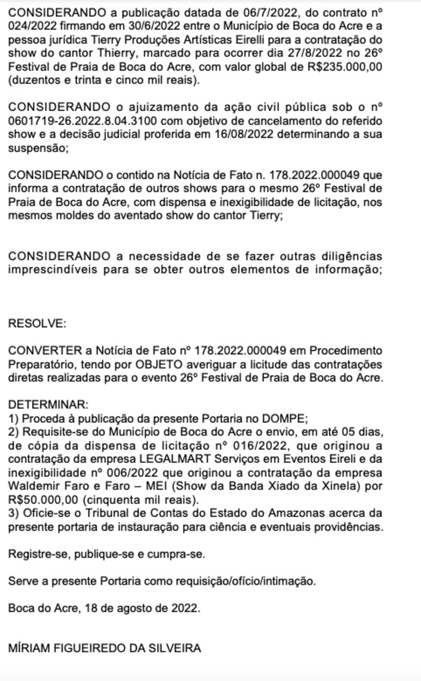 A Prefeitura de Boca do Acre tem 5 dias para apresentar cópia da dispensa de licitação que contratou a empresa Legalmart Serviços em Eventos Eireli e também da Inexigibilidade de Licitação que originou a contratação da empresa Waldemir Faro e Faro – MEI, empresa responsável pela Banda Xiado da Xinela.