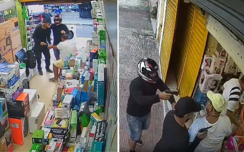 Nas imagens, dois homens chegam ao local em uma motocicleta e realizam a ação criminosa em poucos segundos, em frente a uma loja da região. Logo após o crime, a dupla foge em alta velocidade e segue por ruas do centro da capital.