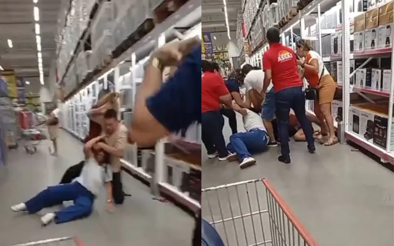 Além disso, durante a confusão, o homem também aparece nas imagens agredindo uma das mulheres com socos no rosto. A situação só foi controlada após a intervenção de funcionários do supermercado.