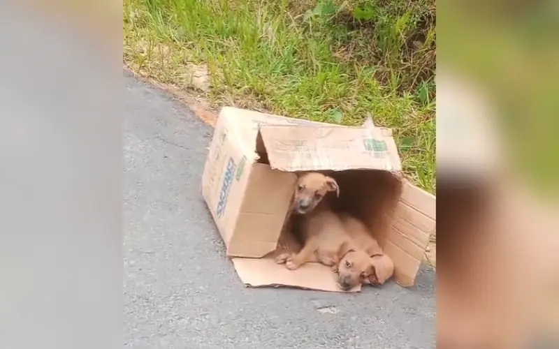 Vídeos compartilhados em aplicativos de mensagens mostram três filhotes dentro de uma caixa, enquanto a cadela e outro cachorro caminham pela via. No registro, a pessoa que grava afirma que os animais haviam sido deixados no local pouco antes da filmagem.