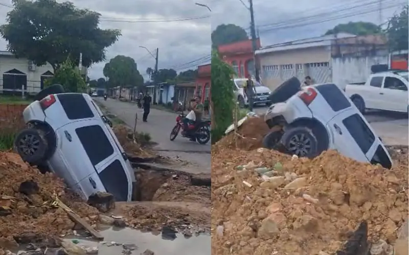 Um carro de passeio ficou preso na manhã desta quinta-feira (16) após cair em uma cratera aberta no conjunto Canaranas, no bairro Cidade Nova, zona norte de Manaus.