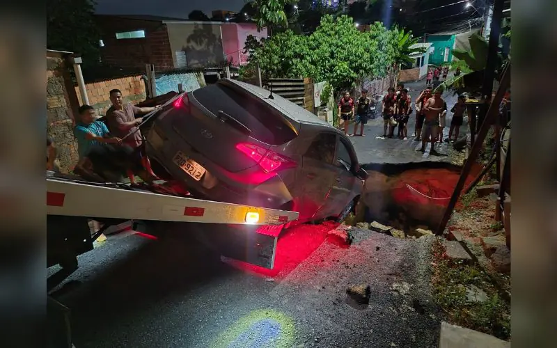 A forte chuva que atingiu Manaus na noite de quarta-feira (25) provocou um incidente impressionante na zona Oeste da cidade. Por volta das 22h26, o asfalto cedeu na rua Osvaldo Andrade, Conjunto Parque São Pedro, bairro Tarumã, e um carro acabou sendo “engolido” por uma cratera que se abriu repentinamente na via.