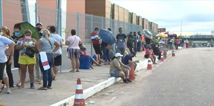 O centro de testagem da covid-19 localizado dentro do Centro de Convenções Vasco Vasques, na avenida Pedro Teixeira, amanheceu com uma fila extensa do lado fora novamente nesta quinta-feira (20).