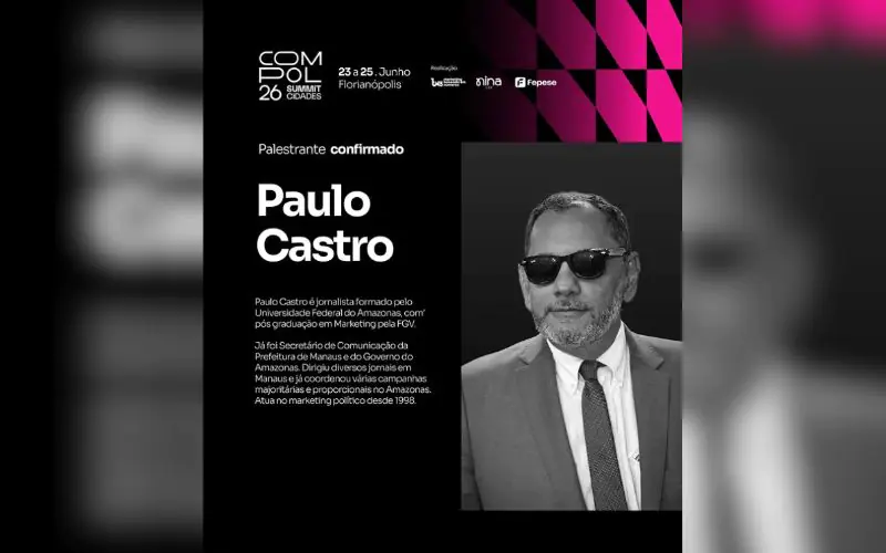 O jornalista e estrategista político Paulo Castro está confirmado no Compol Brasil 2026, que acontecerá entre os dias 23 a 25 de junho, em Florianópolis (SC). Com trajetória consolidada no marketing político, ele atua na área desde 1998 e acumula experiência em campanhas eleitorais no Amazonas.