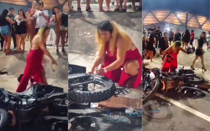 Um vídeo que circula nas redes sociais mostra o momento em que uma mulher, visivelmente irritada, decide “descontar” a frustração em uma motocicleta caída no chão — e vai direto ao ponto: o pneu.
