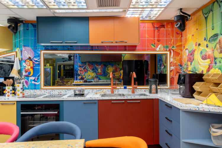 Na cozinha, o contraste marca a divisão entre os grupos: o VIP ocupa um espaço colorido, com estampa de frutas, enquanto a Xepa segue o visual preto e branco.
