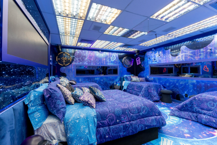 Os quartos seguem o conceito de sonhos específicos. O “sonho da eternidade” traz tons de azul e roxo e estampas de relógios nas paredes, no piso e na roupa de cama. Já o “sonho de voar” aposta em nuvens, céu alaranjado, tecidos esvoaçantes e figuras humanas flutuando. No andar superior, o quarto do “sonho do grande amor” apresenta uma paleta que vai do rosa ao vinho, com corações, cupidos e um espaço aconchegante.