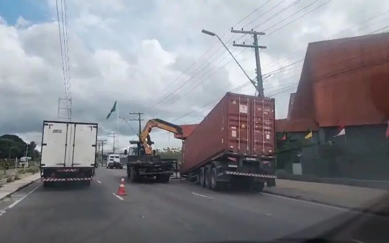 Durante o trajeto, a estrutura metálica se soltou do cavalo mecânico e tombou parcialmente. Parte do contêiner ficou sobre a pista de rolamento, enquanto a outra ocupou a calçada, comprometendo a circulação no local.