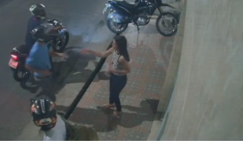 Por volta das 19h30, no vídeo, é possível perceber que uma das mulheres estava usando capacete indicando que tinha descido de uma motocicleta que estava estacionada na calçada.