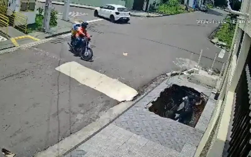 Nas imagens, o jovem caminha tranquilamente pela rua quando o chão cede de repente, engolindo-o por completo. O buraco surge de forma súbita, surpreendendo quem estava por perto.