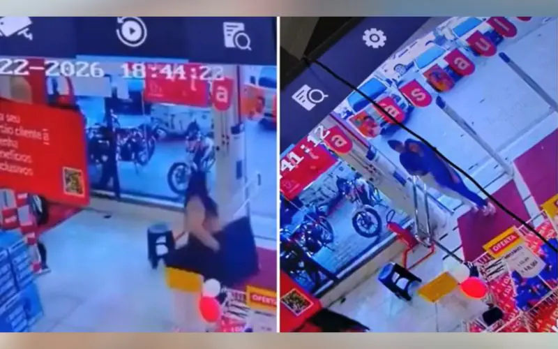 O vídeo mostra as suspeitas deixando o estabelecimento pela porta da frente, carregando a TV sem demonstrar pressa ou levantar suspeitas no momento da saída.