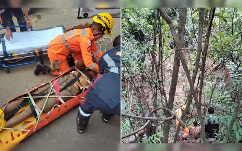 Quando os bombeiros chegaram, a vítima estava consciente, mas apresentava ferimentos na sola dos pés, escoriações pelo corpo e um corte no joelho direito — todos compatíveis com a queda.