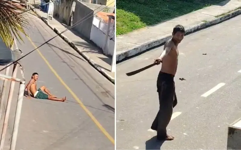 A vítima apresenta um corte profundo no joelho. Há suspeita de que o ferimento tenha sido provocado pelo próprio homem que aparece nas imagens empunhando a arma branca.