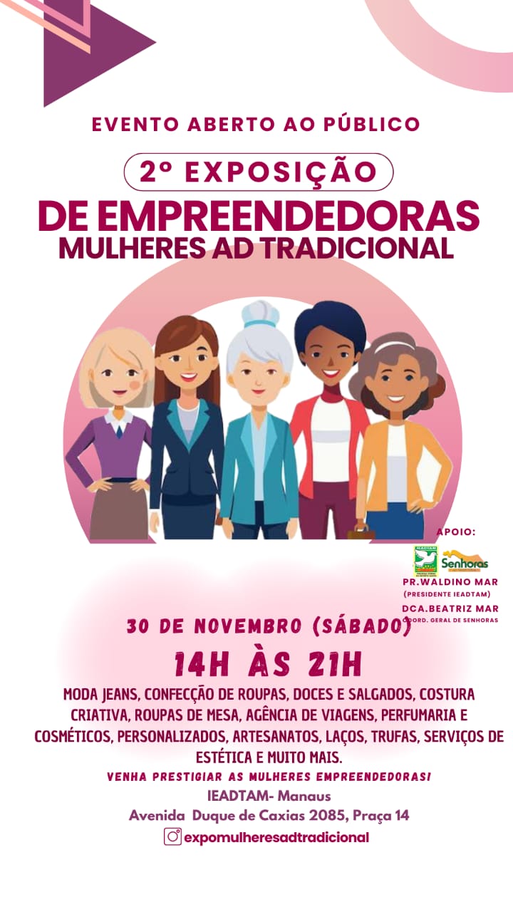 Neste sábado, 30 de novembro, a Igreja Assembleia de Deus Tradicional (Ieadtam) realizará a 2ª Exposição de Mulheres Empreendedoras, um evento que visa valorizar e expandir as habilidades comerciais das mulheres envolvidas na AD Tradicional. A exposição, que acontecerá das 14h às 21h no Templo Sede, contará com a participação de 24 estandes, abrangendo diversos segmentos, desde artesanato até confeitaria.