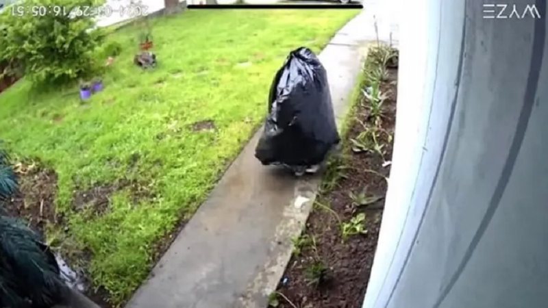 Uma câmera de segurança de uma casa na Califórnia, nos Estados Unidos, flagrou o momento em que um ladrão inusitado se disfarça dentro de um saco de lixo para conseguir furtar uma encomenda que foi deixada na porta da residência.