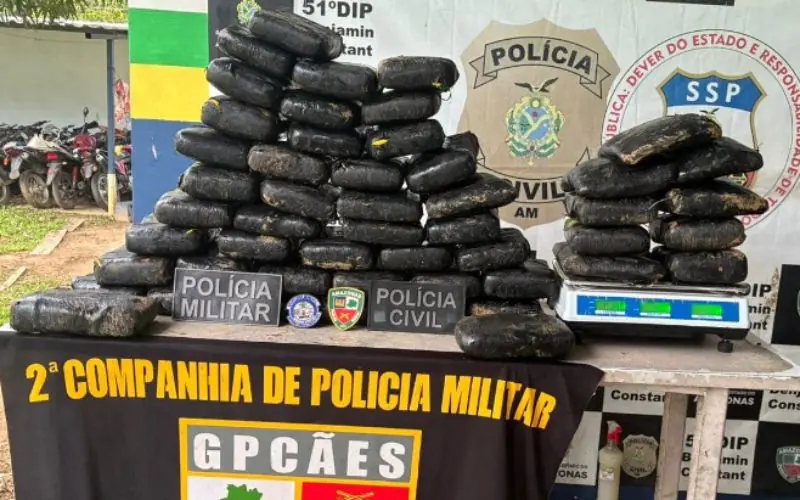 A Polícia Civil apreendeu, nessa terça-feira (03), 59 quilos de maconha avaliados em R$ 1,1 milhão, em Benjamin Constant. O entorpecente estava numa área de mata no conjunto Alonso Ipuchima, no município.