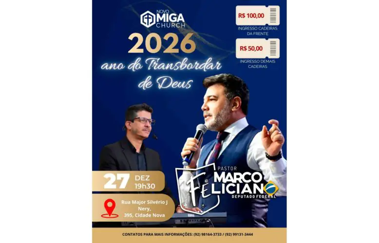 A capital amazonense recebe, no próximo dia 27 de dezembro, o pastor, conferencista e deputado federal Marco Feliciano para a conferência “2026: Ano do Transbordar”. O evento será realizado a partir das 19h30, na Novo Miga Church, localizada na Rua Major Silvério J. Nery, nº 395, bairro Cidade Nova, zona Norte de Manaus.