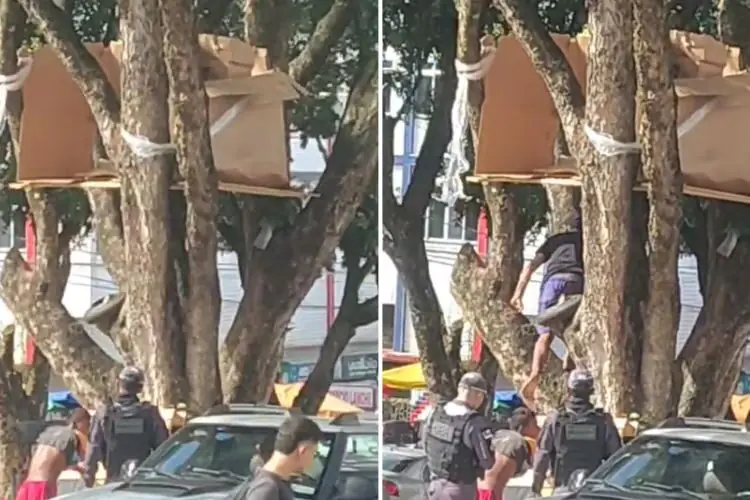 Na imagem, policiais militares aparecem conversando com dois homens e um deles sobe na árvore. Não se sabe até o momento se a moradia improvisada continua no lugar ou se os PMs obrigaram a retirada da estrutura no local.
