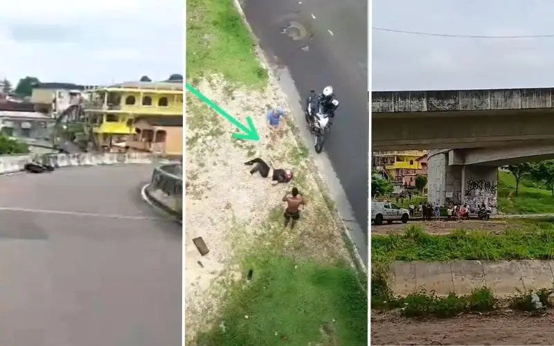 Logo depois do impacto, a motocicleta permaneceu na parte superior do viaduto. Já o piloto caiu de uma altura significativa, atingindo uma área de gramado ao lado da pista inferior.
