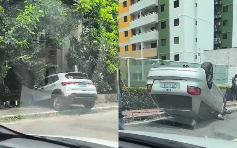 Logo depois, o segundo veículo ultrapassou a área de proteção e invadiu as grades do condomínio Jardim Califórnia, onde ficou preso à estrutura. Enquanto isso, o carro capotado permaneceu na via, com partes espalhadas pelo asfalto, causando transtornos no trânsito da região.