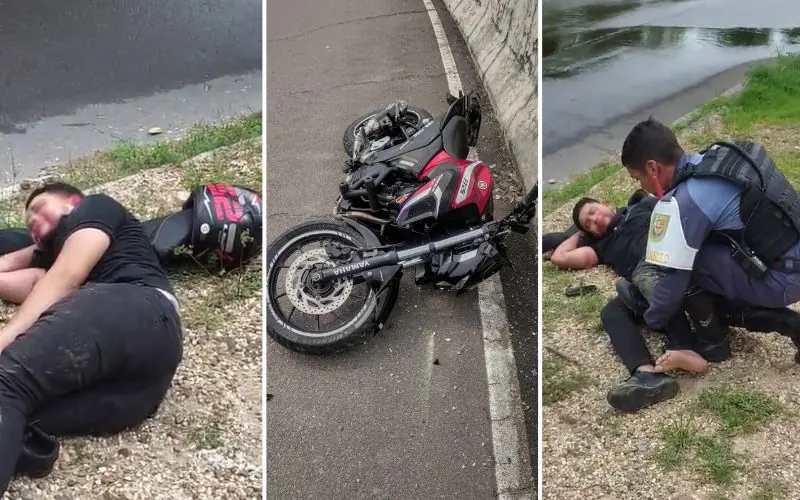 No entanto, devido à alta velocidade, perdeu o controle da moto, colidiu contra a mureta de proteção e foi arremessado de uma altura significativa, estimada entre 7 e 10 metros.