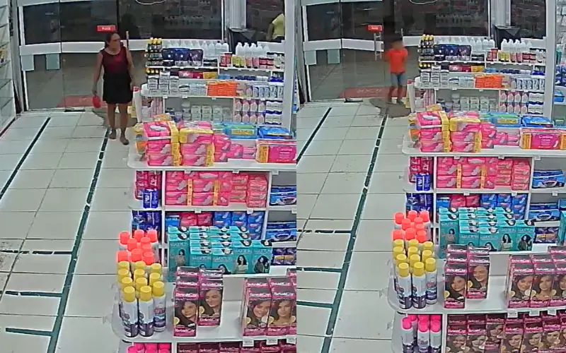 As imagens mostram a mulher orientando a criança passo a passo, em uma clara aula de bandidagem, enquanto observa o ambiente. Em seguida, o menino executa a ação e retira os produtos das prateleiras, obedecendo às ordens da suspeita. Toda a movimentação acontece de forma rápida, mas suficiente para comprovar a participação ativa da mulher.
