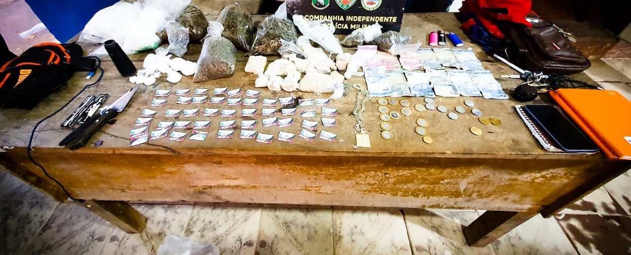 Ainda conforme os policiais militares, com os homens foram encontrados e apreendidos quase dois quilos de entorpecentes, entre cocaína, maconha e oxi; três bolsas; um carregador de celular; um celular; três isqueiros; um fone de ouvido; um cordão; duas facas; 47 adesivados (para embrulho de entorpecentes); um dechavador (espécie de moedor e triturador de maconha); três cadernos de anotações; e R$ 16,35 em espécie.