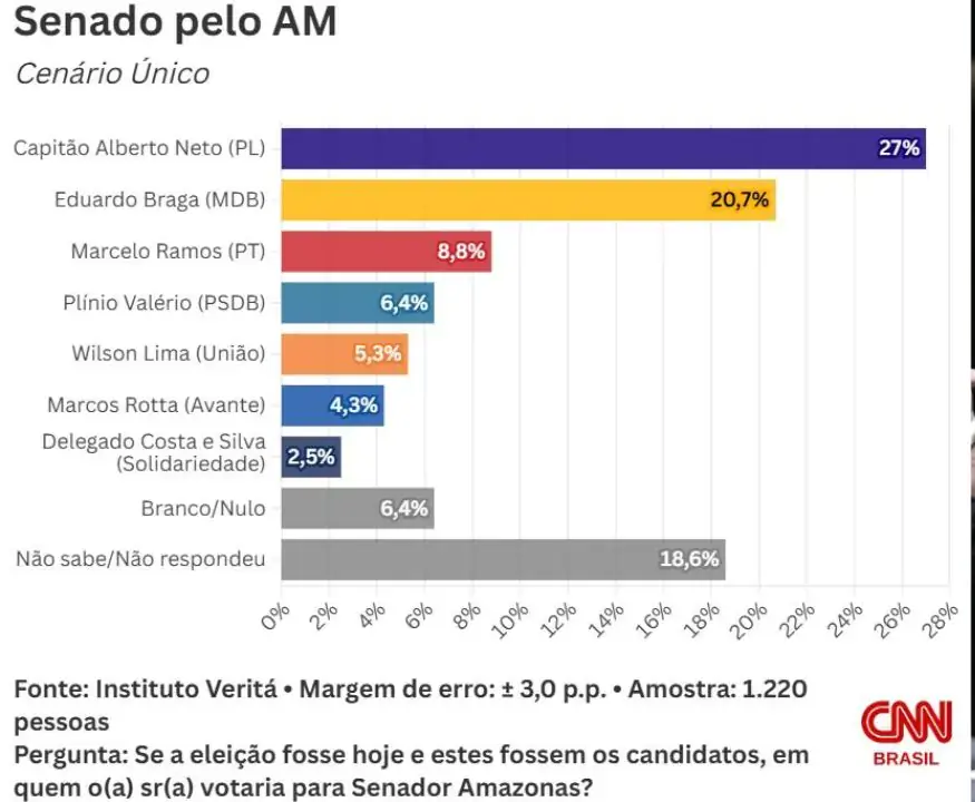De acordo com o levantamento realizado pelo Instituto Veritá, o parlamentar aparece com 27,0% das intenções de voto. A pesquisa ocorreu entre os dias 18 e 24 de março, e ouviu 1.220 eleitores em Manaus e em outros dez municípios do interior do estado.
