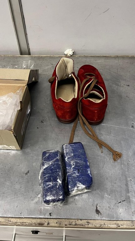 Durante os trabalhos, a PF identificou uma mulher que carregava consigo um pacote de papelão suspeito, sendo que, durante a abordagem, verificou-se que dentro dele havia droga escondida em dois sapatos.