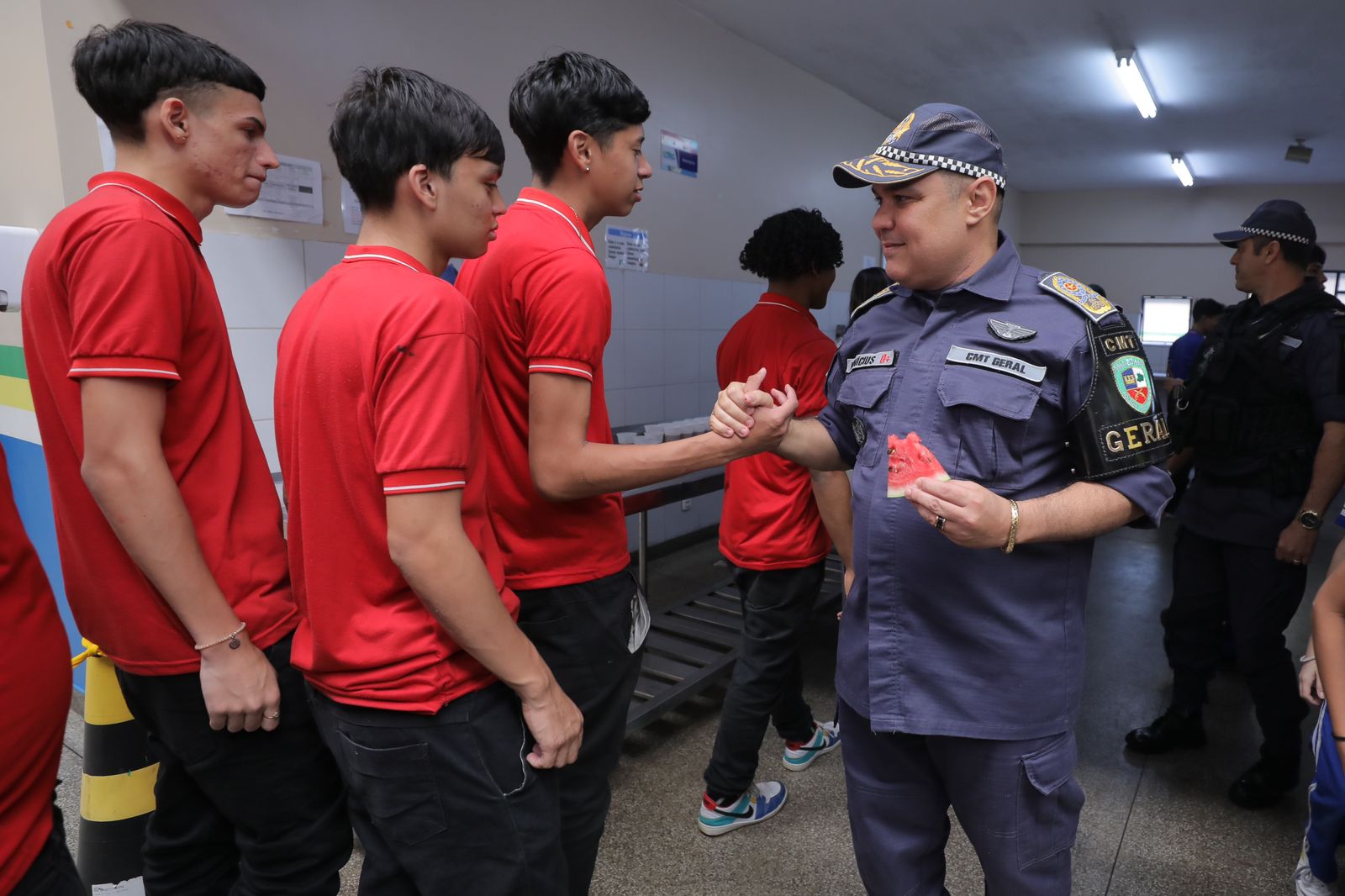 O Comandante-Geral da PMAM, Coronel Vinícius Almeida, esteve na Escola Estadual Áurea Braga, localizada no bairro Compensa, na zona oeste de Manaus, onde conversou com alunos, professores e gestão da unidade escolar.