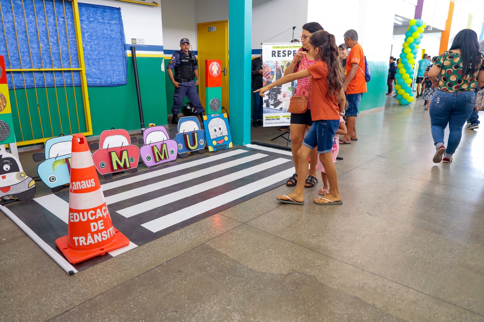 Nas atividades lúdicas, o IMMU apresenta itens obrigatórios dos veículos como o cinto de segurança, equipamentos de segurança da motocicleta e a vivência na faixa de pedestre.