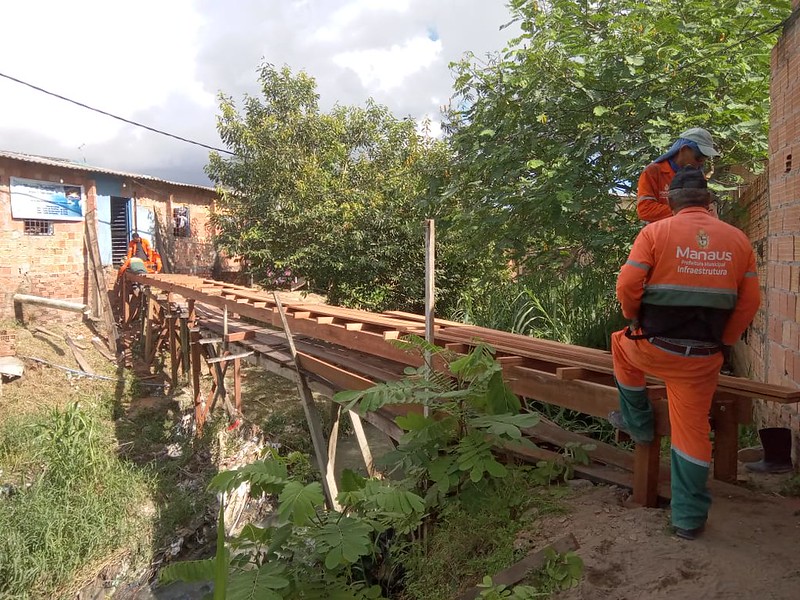 A Prefeitura de Manaus, por meio da Secretaria Municipal de Infraestrutura (Seminf), iniciou, nesta sexta-feira, 3/2, a obra de implantação de 30 metros de ponte de madeira na rua Acre, bairro Tarumã, zona Oeste. No local, uma estrutura antiga, instalada há mais de uma década, estava sem infraestrutura com vários trechos de instabilidade devido à falta de reparos, prejudicando a travessia dos pedestres que moram na região.