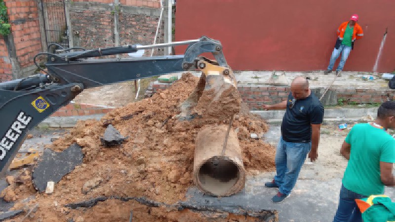 A Prefeitura de Manaus, por meio da Secretaria Municipal de Infraestrutura (Seminf), atua, nesta quarta-feira, 21/12, na recuperação de uma rede de drenagem profunda rompida na rua 12, comunidade Vale do Sinai, bairro Cidade Nova, na zona Norte da capital. A antiga tubulação estava obstruída, impedindo a passagem da água, provocando uma cratera no meio da via.