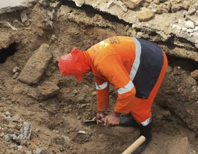 No local, as equipes executam o envelopamento da tubulação com uma técnica que garante maior estabilidade e durabilidade à rede de drenagem. Após essa etapa, será realizado o aterro da área e a reconstrução da calçada, que também foi danificada.
