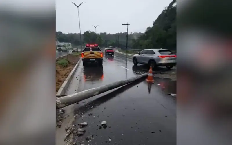 A suspeita é de que o poste tenha sido atingido por um veículo durante a madrugada, mas o carro envolvido não foi encontrado no local. A situação é agravada pela chuva intensa que atinge a capital amazonense desde a madrugada, com o asfalto molhado e visibilidade reduzida, o que contribui para o represamento do tráfego.