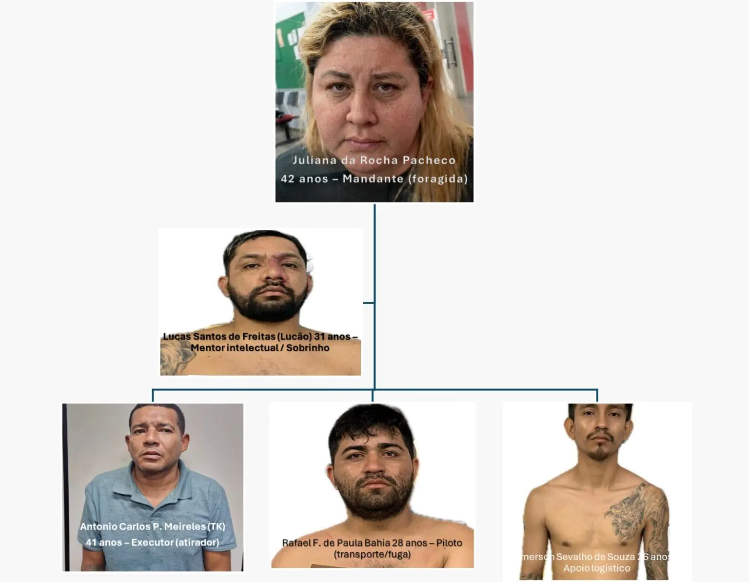 Posteriormente, as autoridades prenderam Antonio Carlos Pinheiro Meireles (“TK”), Emerson Sevalho de Souza, Lucas Santos de Freitas (“Lucão” ou “Magrão”). Todos já possuem passagens por outros crimes.