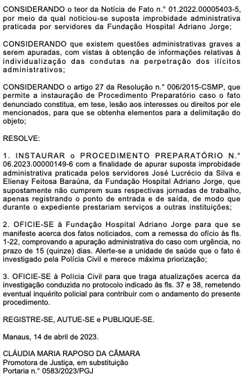 A promotora solicitou com urgência à Fundação Adriano Jorge para que envie, no prazo de 15 dias, documentação comprovando que o caso está sendo apurado internamente pelo hospital.