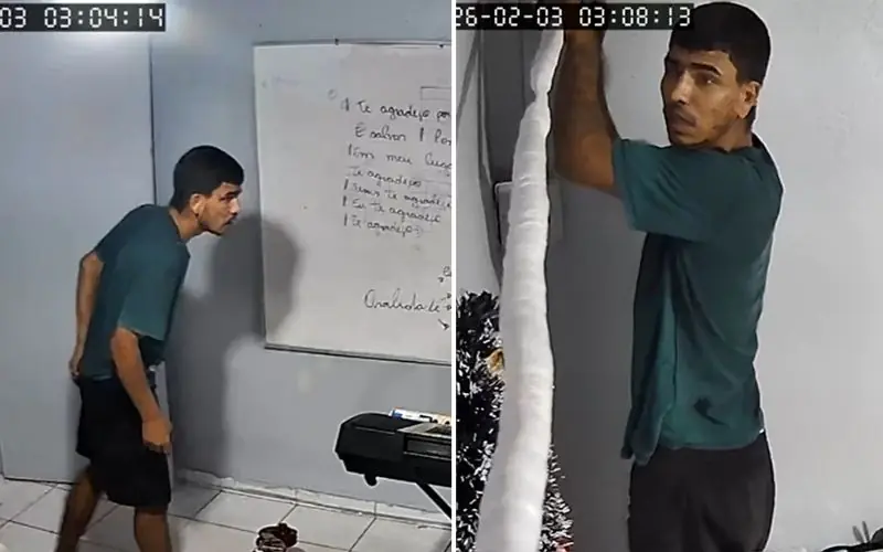 Nas imagens mais recentes, José Augusto aparece circulando de forma agitada dentro da escola e tentando retirar a fiação do ar-condicionado, possivelmente para revenda. A ação causou danos ao local e prejuízos aos proprietários.