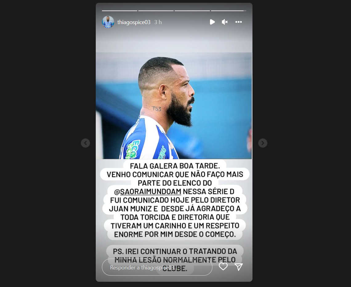 “Fala galera, boa tarde. Venho comunicar que não faço mais parte do elenco do São Raimundo nessa Série D. Fui comunicado hoje pelo diretor Juan Muniz e desde já agradeço a toda a torcida e diretoria, que tiveram um carinho e respeito enormes por mim desde o começo. Irei continuar tratando minha lesão normalmente pelo clube”, publicou o defensor.
