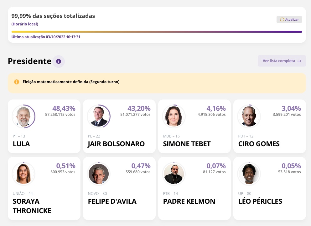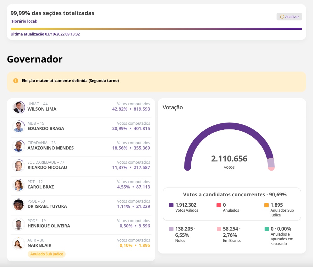 Não há previsão de horário para a conclusão da apuração no estado. Por conta desta urna, a contabilização nacional também está atrasada, com 99,99% das urnas apuradas na votação para presidente da República.