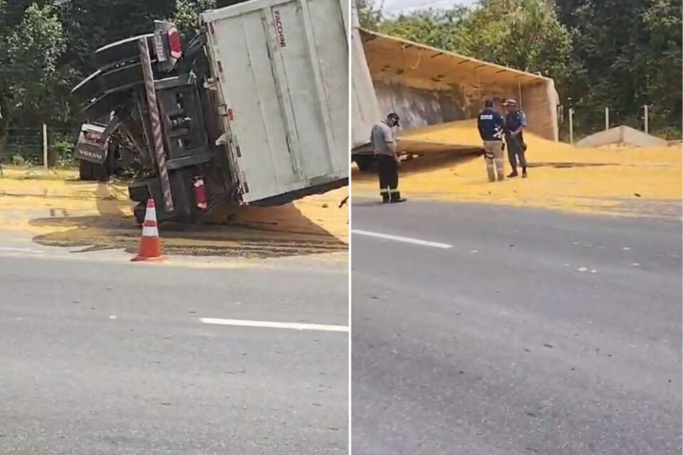 O condutor do veículo informou que um carro lhe fechou durante a curva e ele precisou frear bruscamente, mas o veículo tombou devido ao peso.