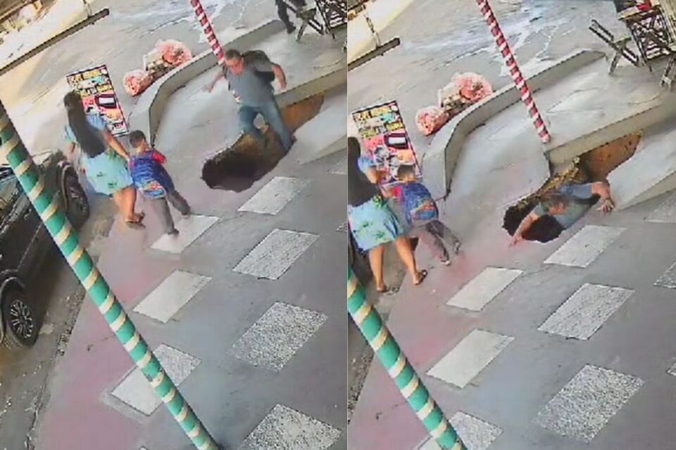 Um vídeo registrado por uma câmera de vigilância mostra o homem caminhando tranquilamente, até que a calçada cede de maneira repentina e provoca sua queda.