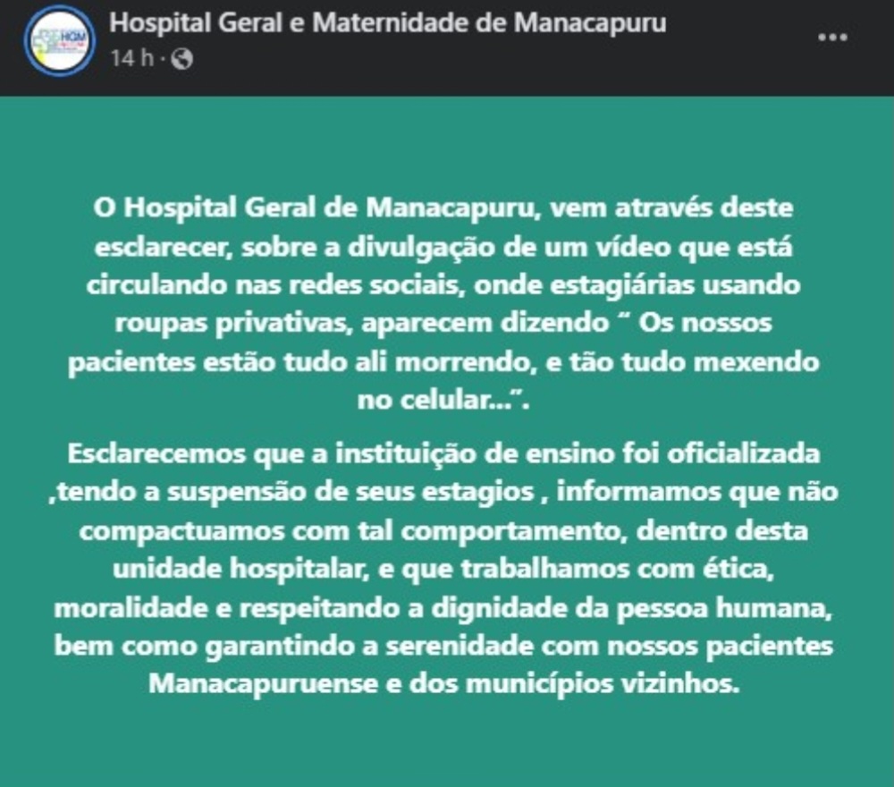 Alunas de enfermagem da Faculdade Metropolitana de Manaus (Fametro), foram suspensas após debocharem dos pacientes no Hospital Geral e Maternidade de Manacapuru, (município distante à 98 quilômetros de Manaus).