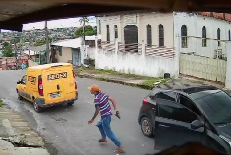 Uma câmera flagrou a ação dos criminosos. No vídeo, é possível ver o funcionário fazendo a entrega de mercadoria em uma residência, quando em certo momento um carro se aproxima e dois homens armados saem do veículo e conseguem rendê-lo.