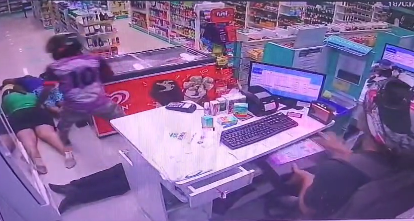 Após perceber que as vítimas estavam rendidas, o comparsa também entra na farmácia. No ângulo de dentro do estabelecimento já é possível observar a tensão das vítimas enquanto os suspeitos anunciam o assalto.