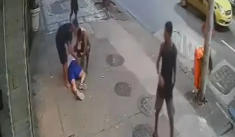 Imagens de câmeras de segurança mostram o momento em que a vítima é abordada por um grupo de jovens e tem os pertences roubados.